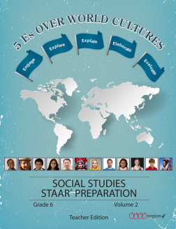 5Es over World Cultures Social Studies STAAR® Preparation for Grade 6, Volume 2 offers vital components of Contemporary World Cultures in series of conceptually designed instructional plans which address the Grade 6 Social Studies Texas Essential Knowledge and Skills (TEKS). Each instructional plan varies in duration, addresses multiple concepts and skills, and features activities that develop analytical thinking skills aligned to Grade 8 American History and high school U.S. History processing standards. 5Es over World Cultures incorporates high-yield instructional strategies, facilitation questions, and discussion points within the 5E format, and includes research-based, student-centered instructional strategies for diverse learners. The digital instructional resources included with this product contains student activity pages, graphics, selected-response assessment items, performance assessments, rubrics, and answer keys.