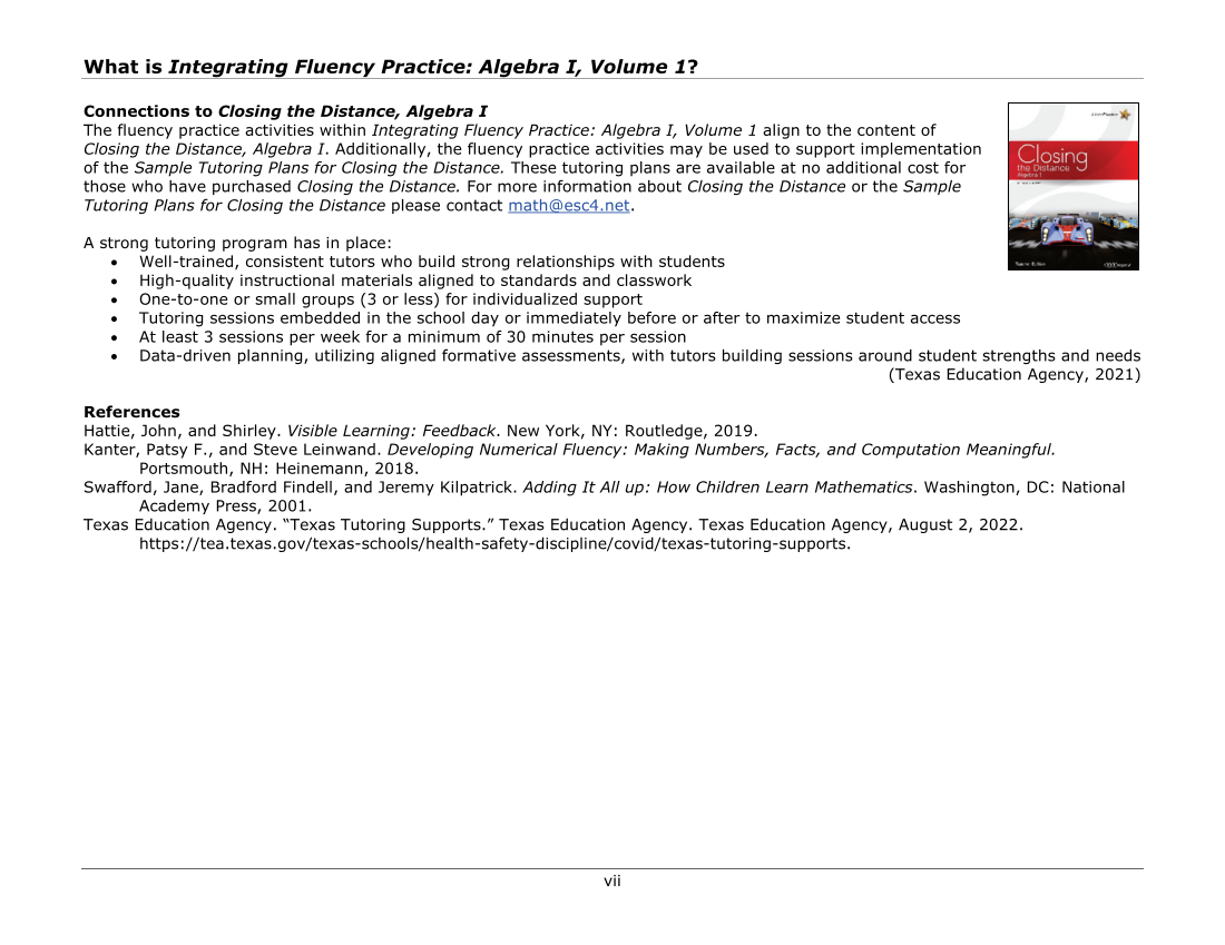 Closing the Distance, Algebra I. Additionally, the fluency practice activities may be used to support implementation